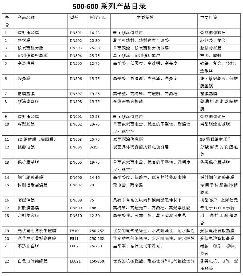 应用于食品、药品等包装和护卡、电绝缘等工业领域,具体品种规格有:普通包装薄膜、镀铝基膜、烫金基膜、护卡基膜、反光基膜、激光防伪基膜、电气绝缘基膜等。